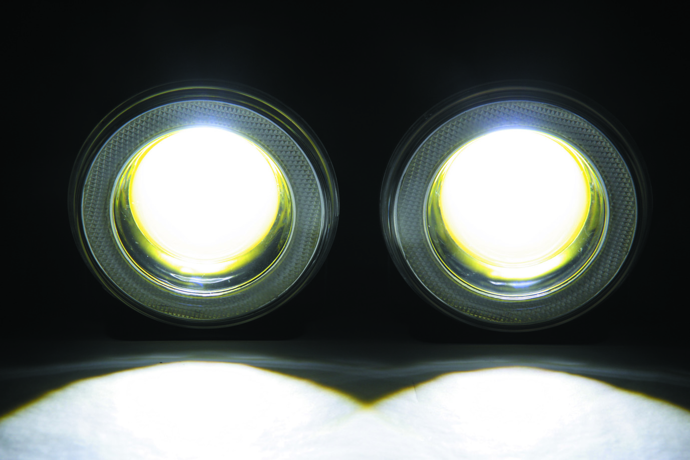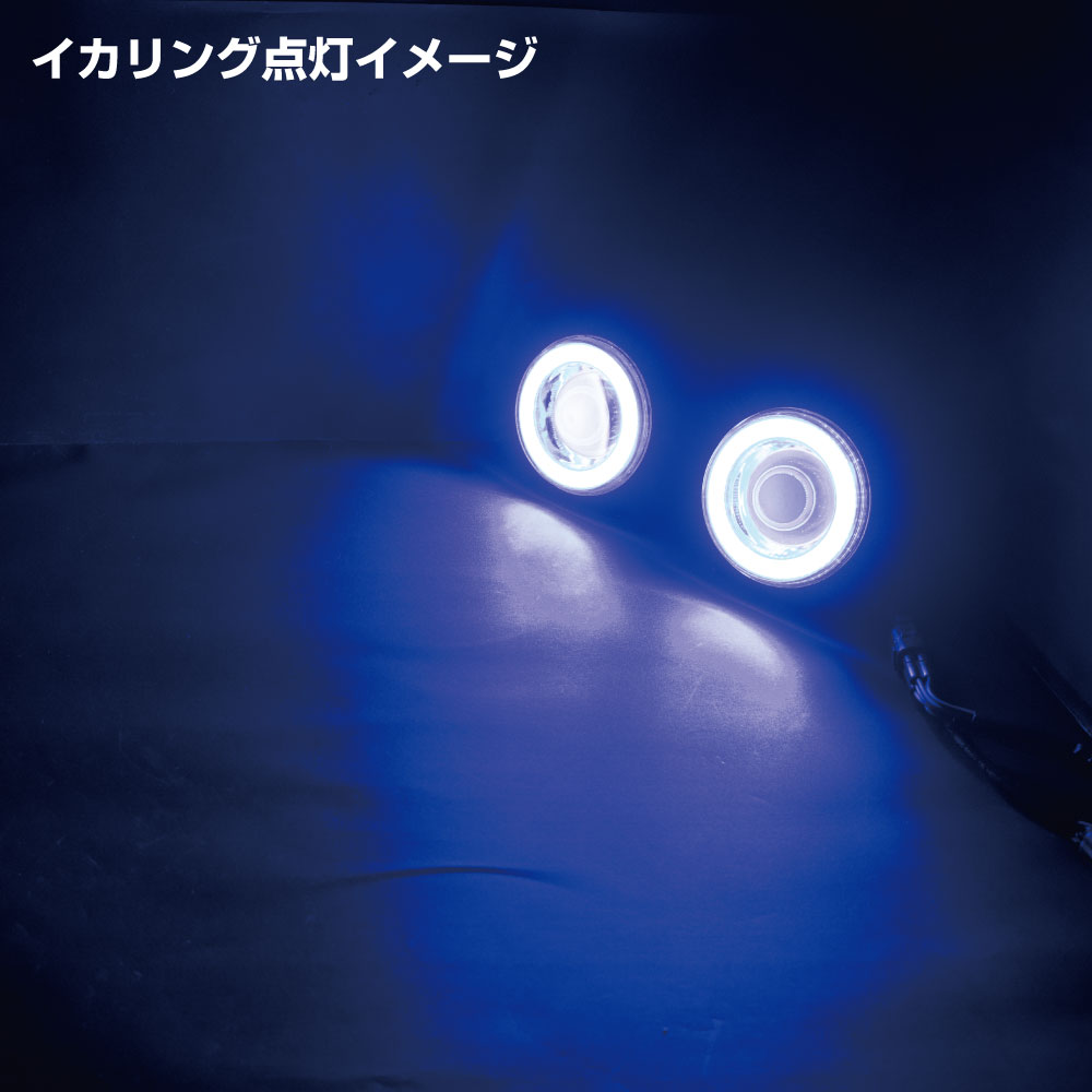 COBフォグランプ。魚眼レンズを使用したホワイト色発光。ブルーに輝くイカリング付で装飾効果も抜群。小型ボディで取付位置に困りません。12/24V車共用。
