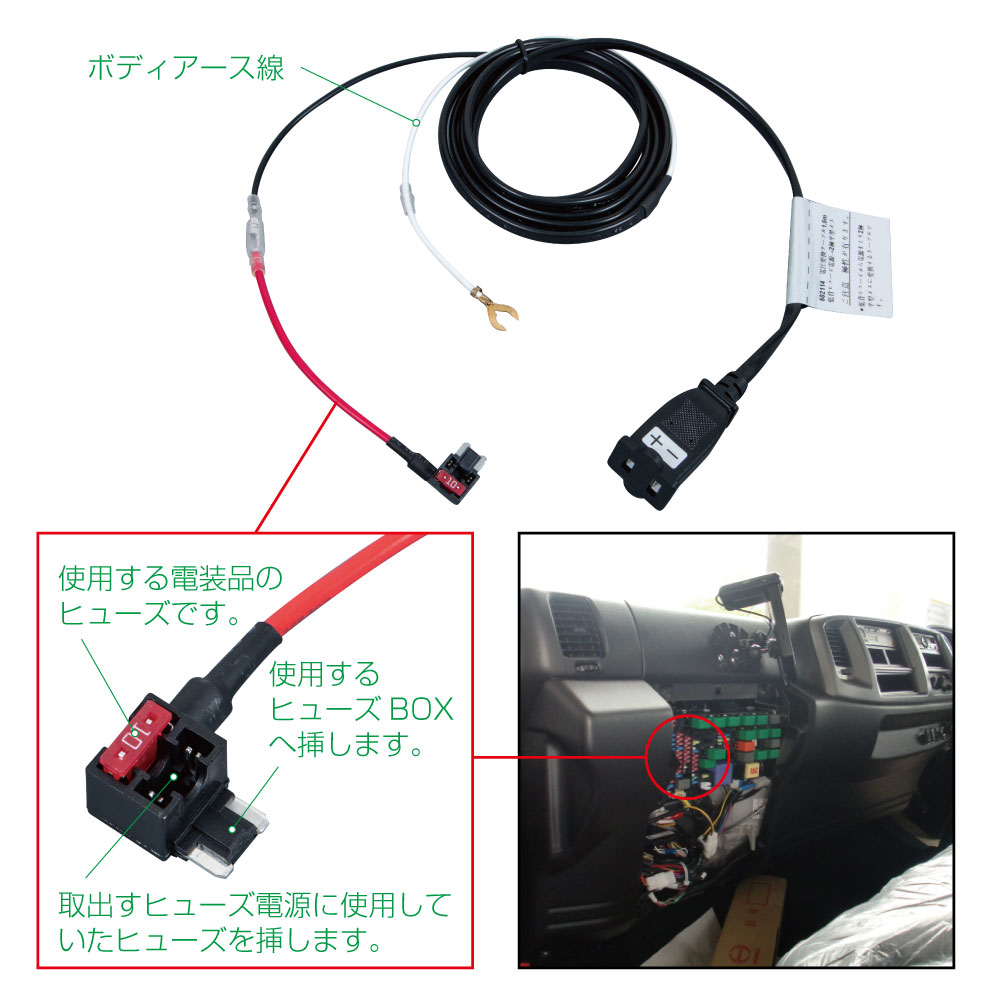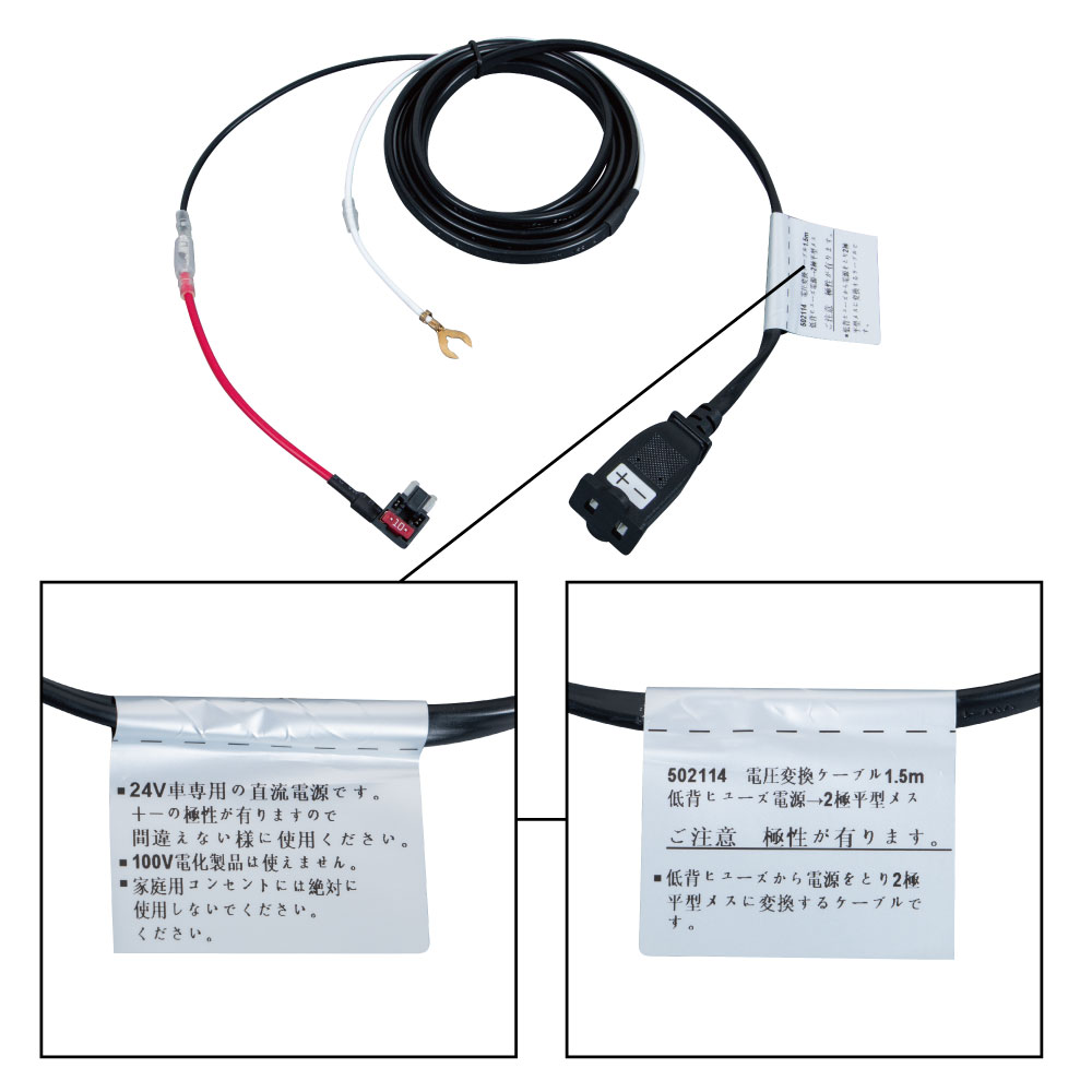 ヒューズBOX等(低背ヒューズ)からDC平型コンセントへ変換することが可能なコードです。
