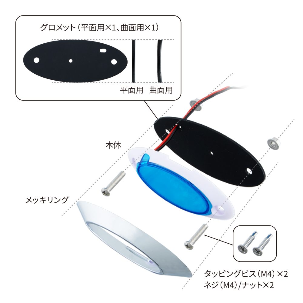 | 内容 | 本体×1、メッキリング×1、グロメット(平面用×1、曲面用×1)、タッピングビス(M4)×2、ネジ(M4)/ナット×2 |
