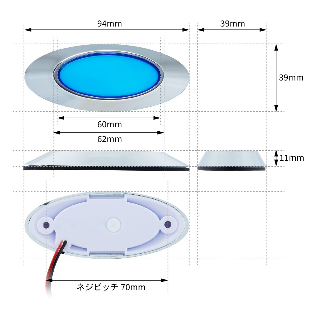 | 明るさ(ルーメン) | ブルー:30、イエロー:200、グリーン:110、ホワイト:150、アイスブルー:125、レッド:65、アンバー:110 |