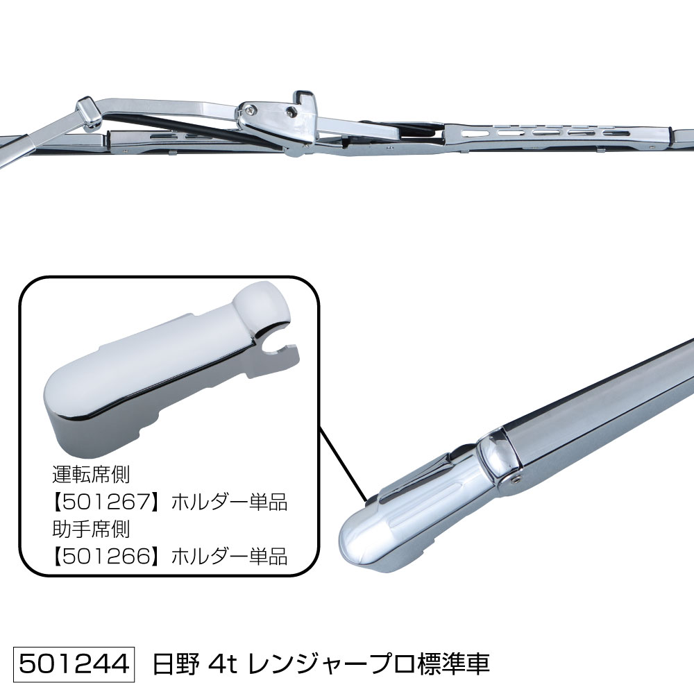 材質 | ワイパーアーム:ステンレス/クロームメッキ、 ワイパーブレード:真鍮/クロームメッキ、 カバー(ホルダー/キャップ):樹脂/クロームメッキ |