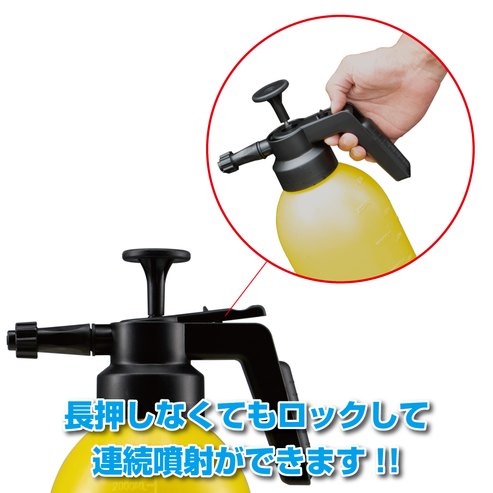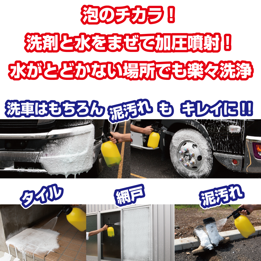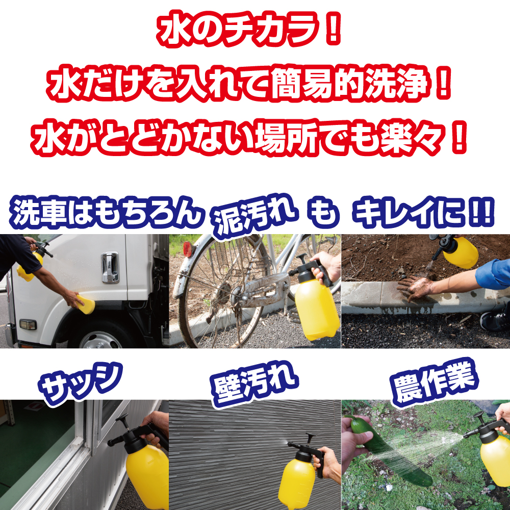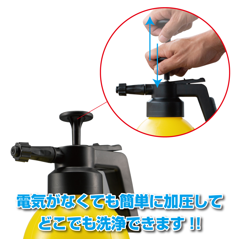 手動で圧力をかけて、お手軽に噴射洗浄ができる1.5ℓ噴射ポンプ。水がない場所でもお手軽に洗車やお掃除ができます。