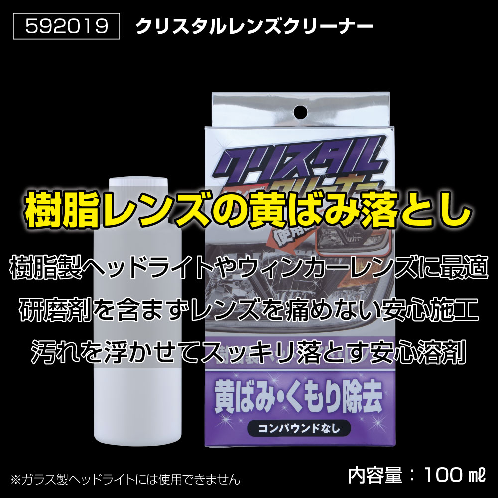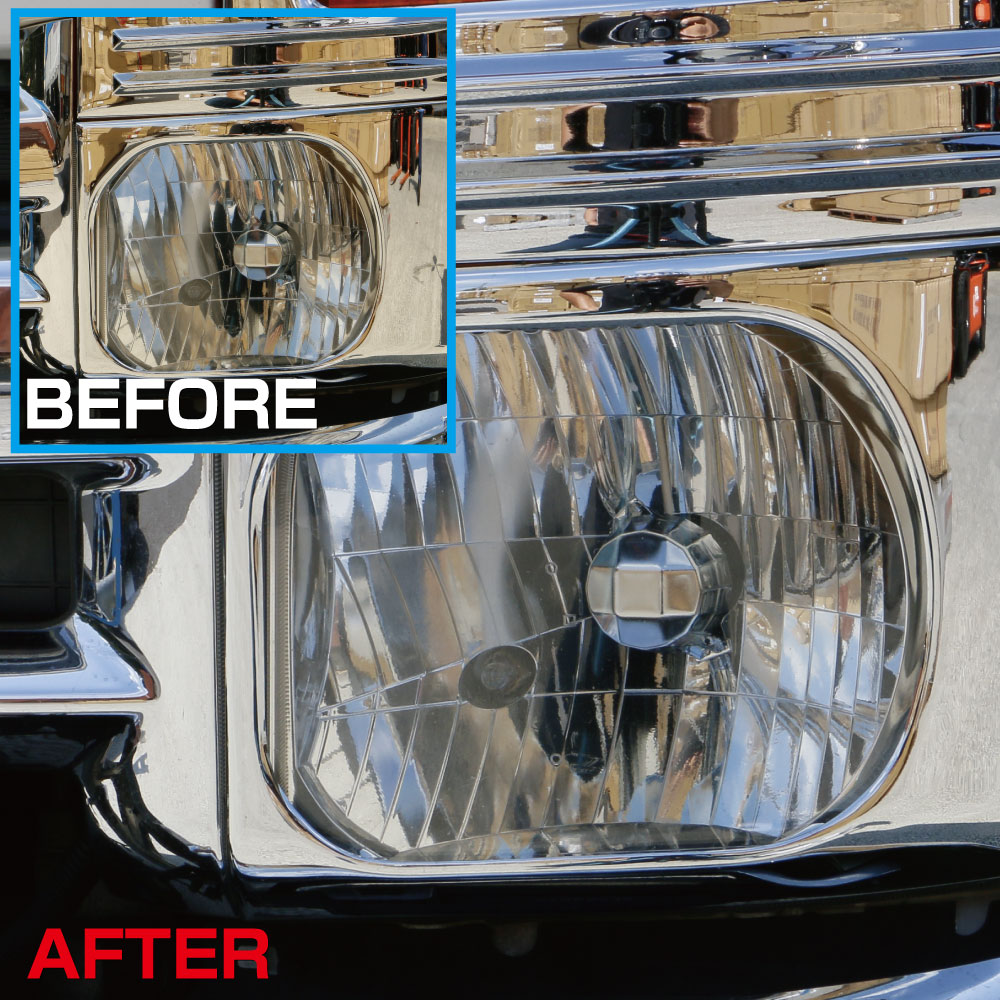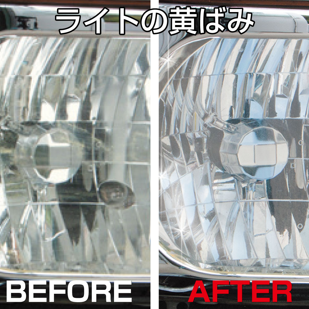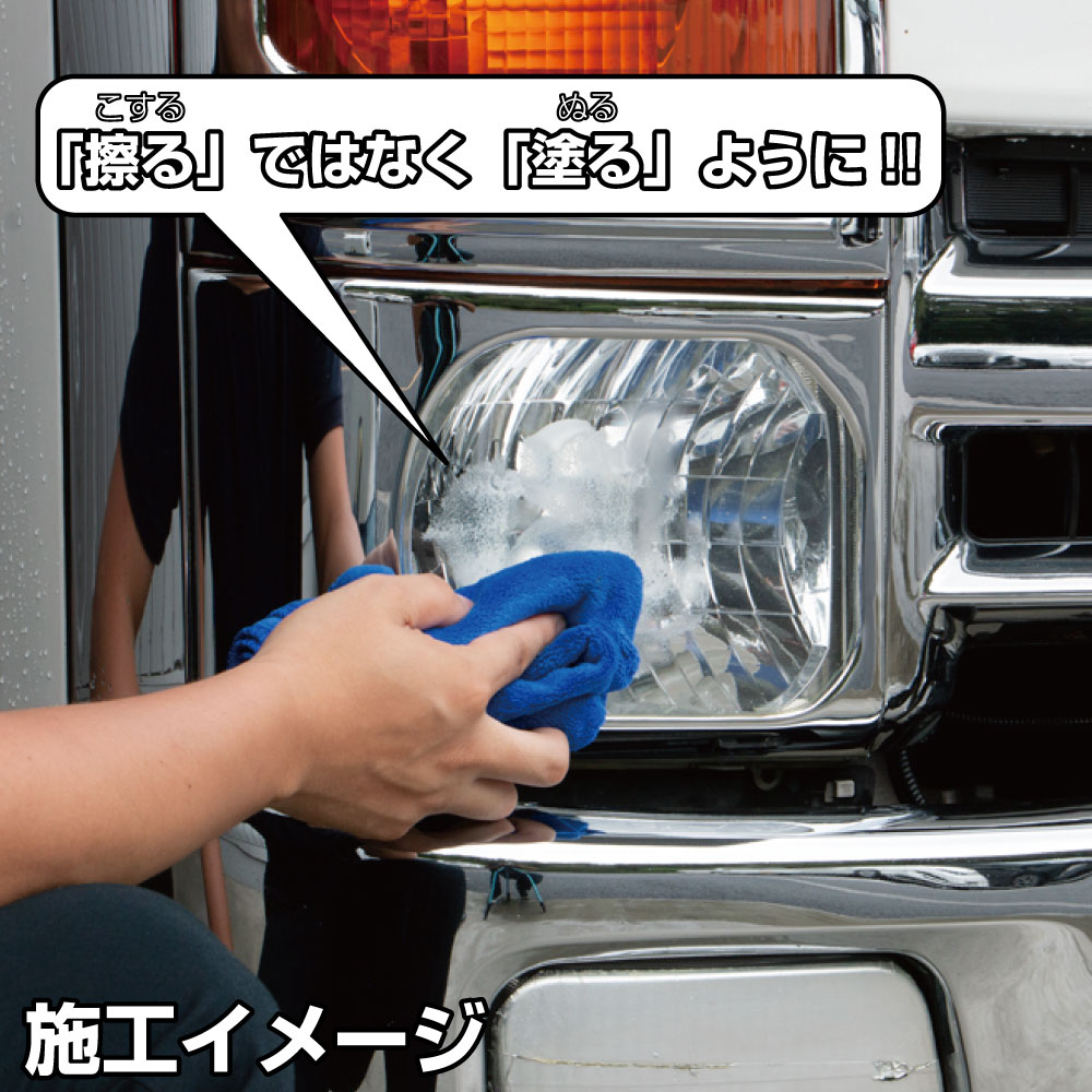 樹脂製のヘッドライトやウインカーレンズなどの黄ばみ・汚れを研磨剤無しでスッキリ落とします。